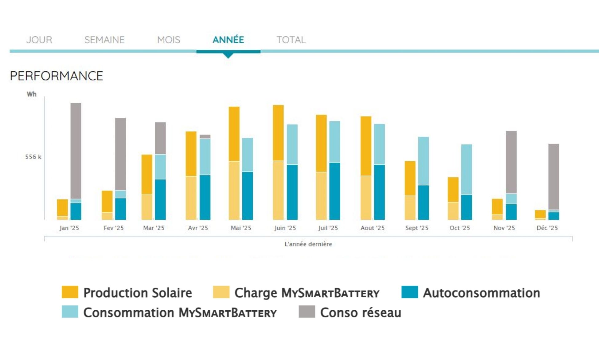 Cette installation permet une réduction de 67,36 % de la consommation issue du réseau. Les données mesurées sur l’année 2025 illustrent concrètement l’impact de la solution mise en place dans un contexte résidentiel.